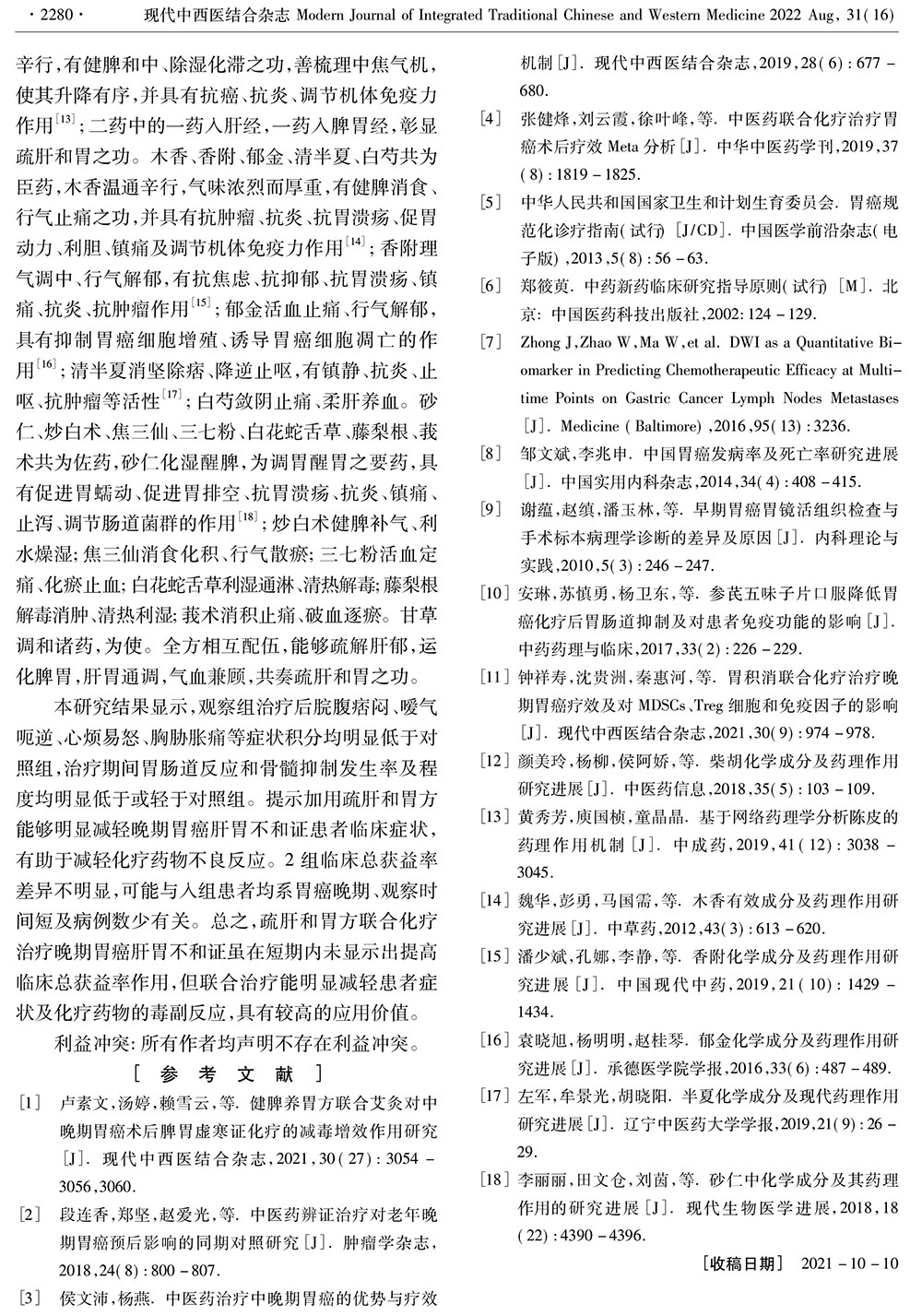 疏肝和胃方对晚期胃癌肝胃不和证患者化疗疗效 及胃肠道反应、骨髓抑制的影响