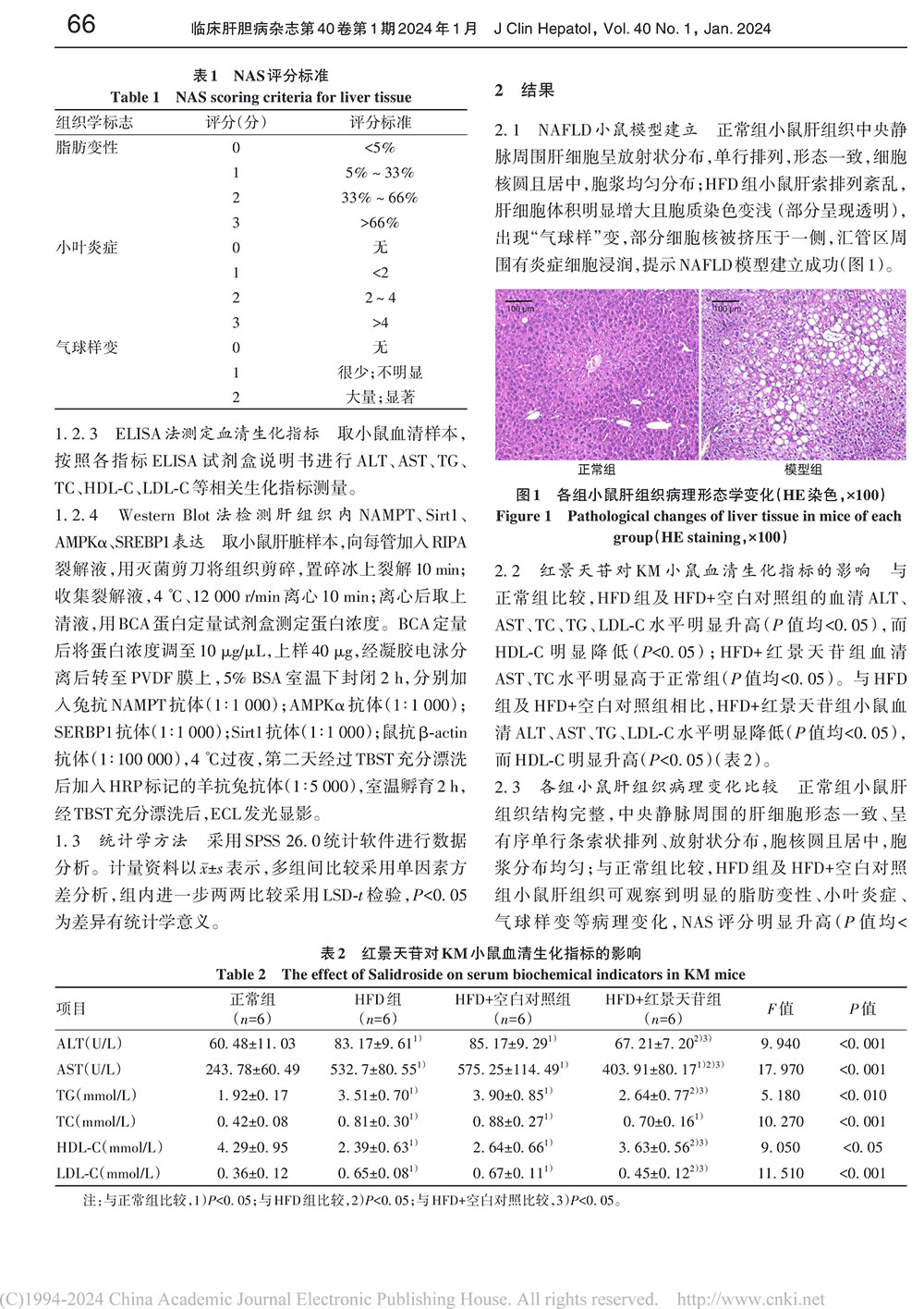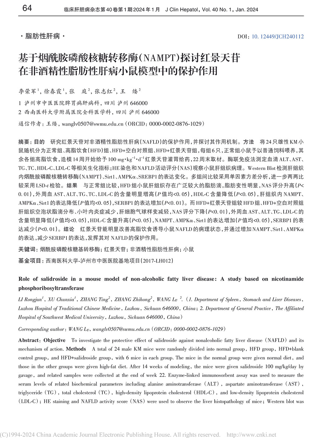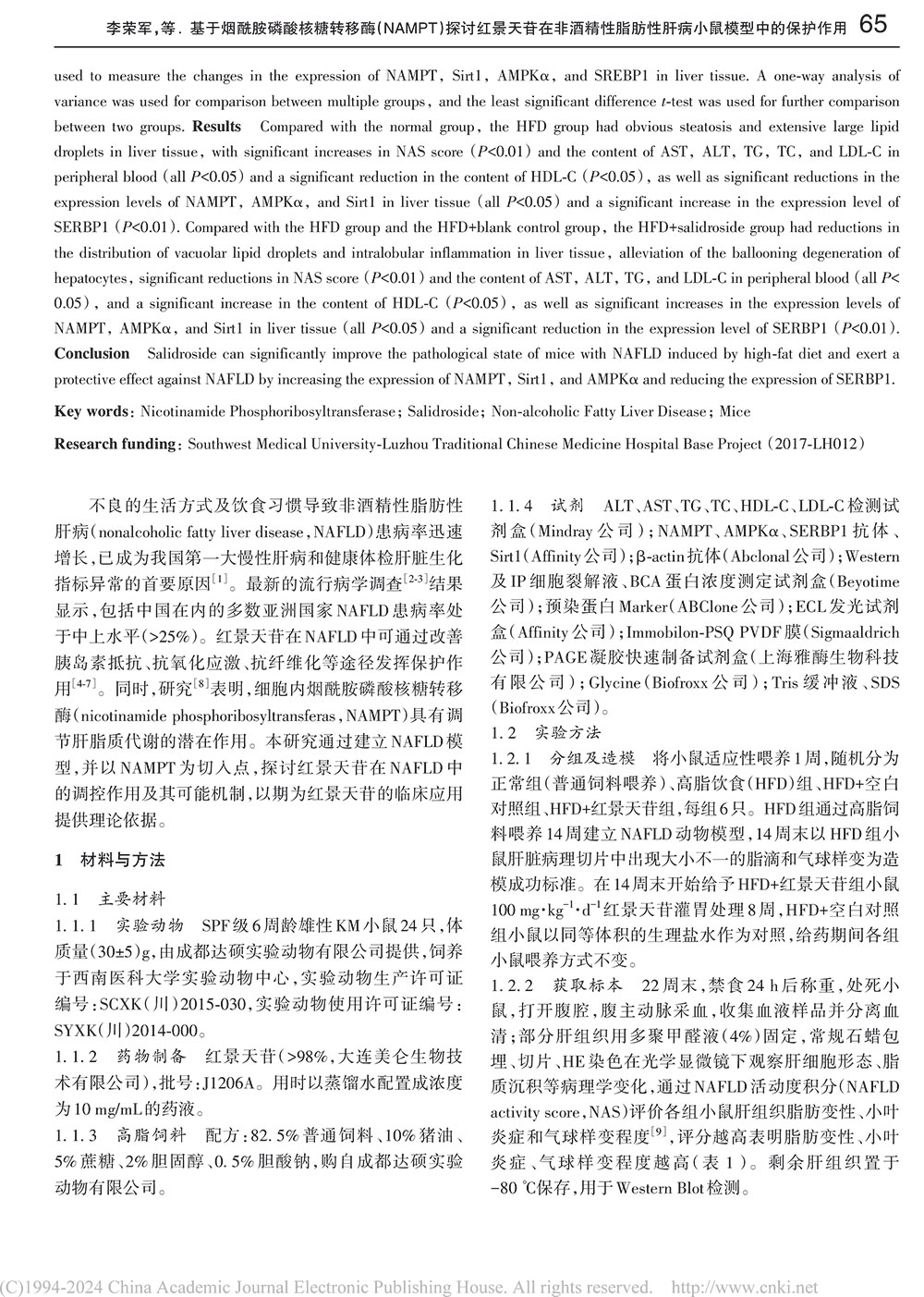 基于烟酰胺磷酸核糖转移酶(NAMPT)探讨红景天苷 在非酒精性脂肪性肝病小鼠模型中的保护作用