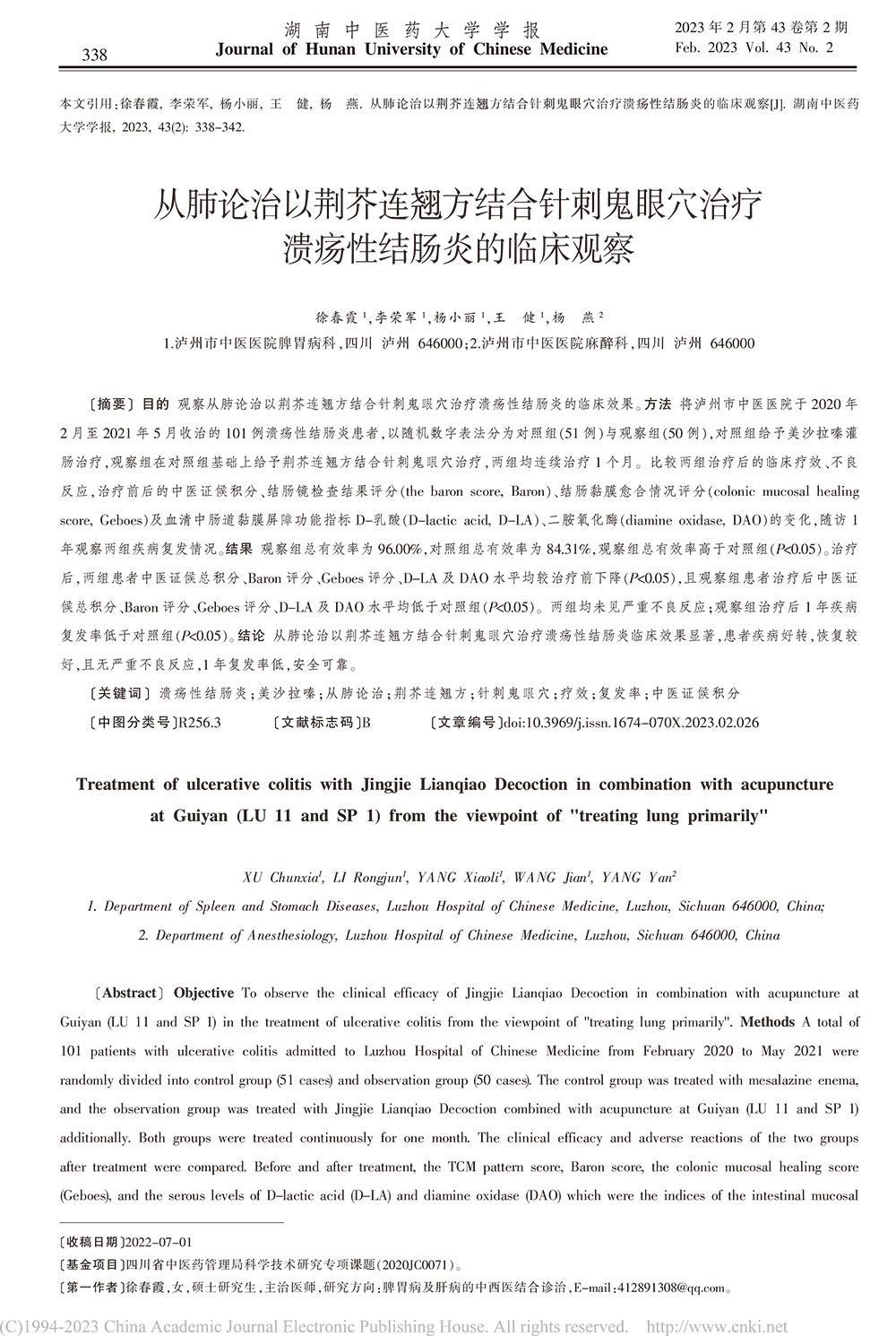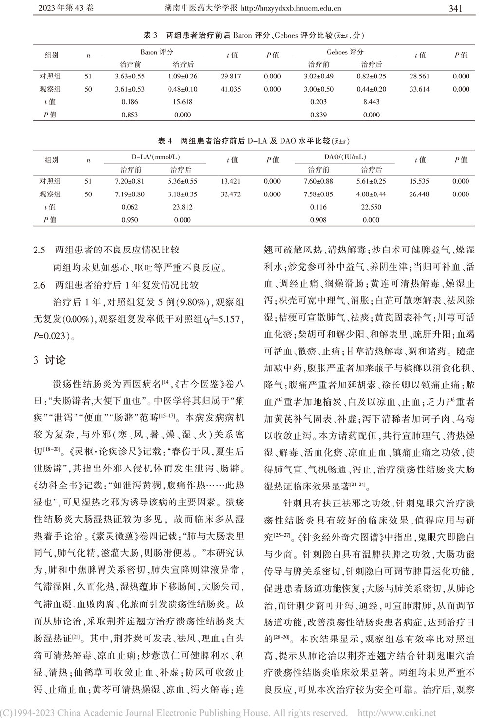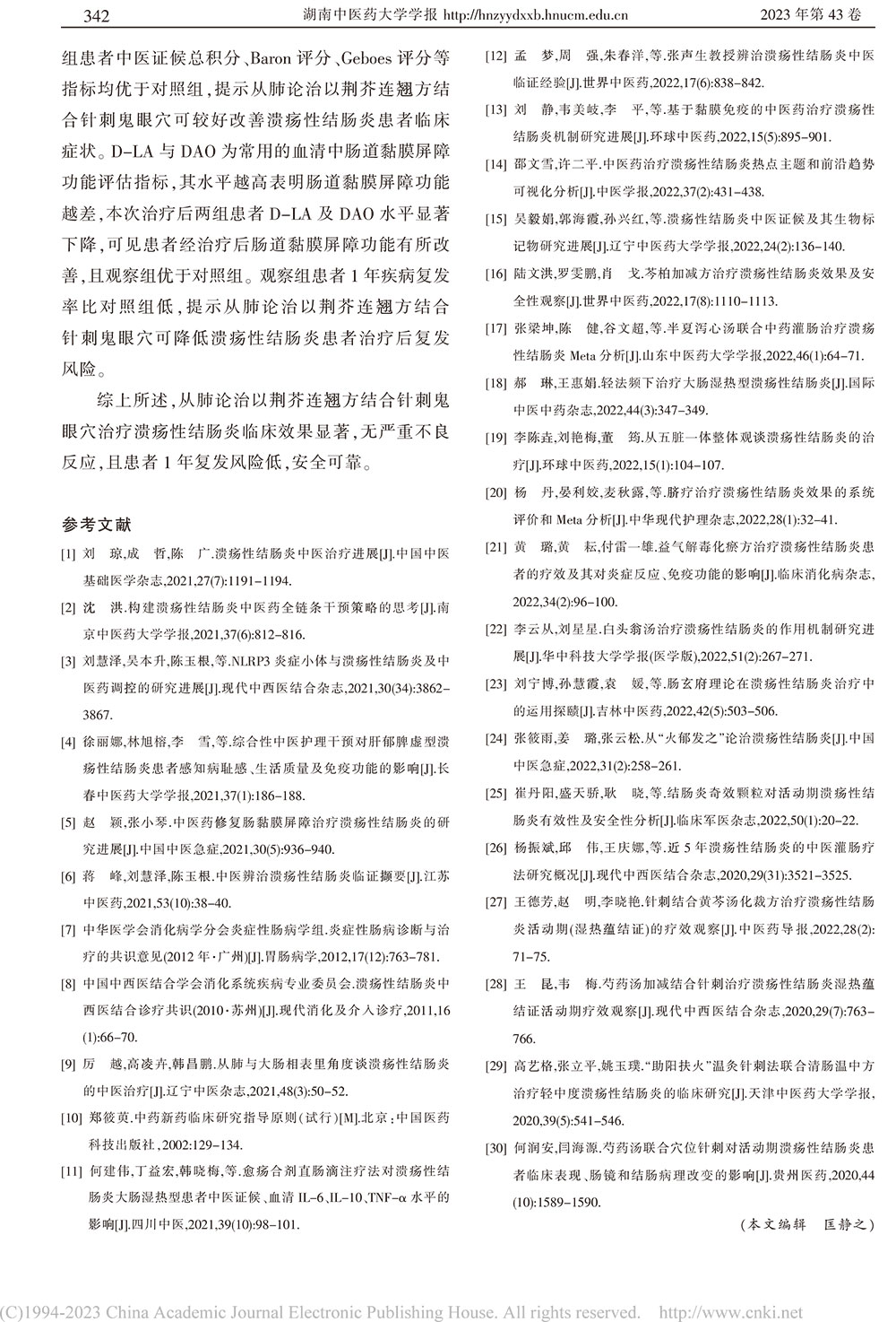 从肺论治以荆芥连翘方结合针刺鬼眼穴治疗 溃疡性结肠炎的临床观察